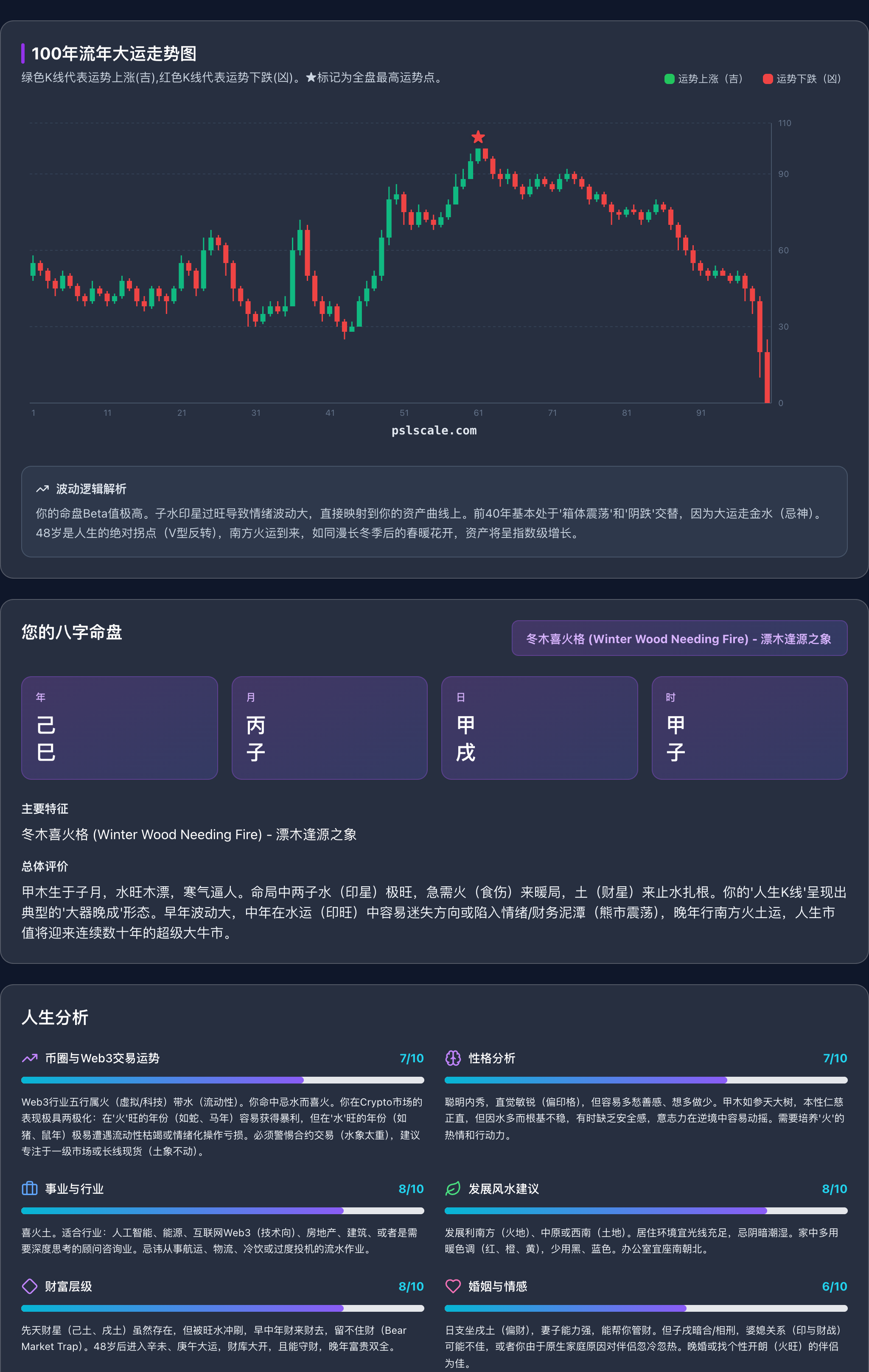 AI将生成完整的100年运势趋势图(K线图),并提供六大维度的详细分析:性格、事业、财富、婚姻、风水和币圈运势。
