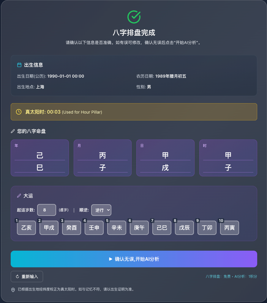 输入出生信息后,系统将计算您的八字命盘,包括四柱、真太阳时和大运周期。您可以查看并编辑信息后再继续。